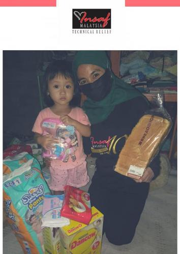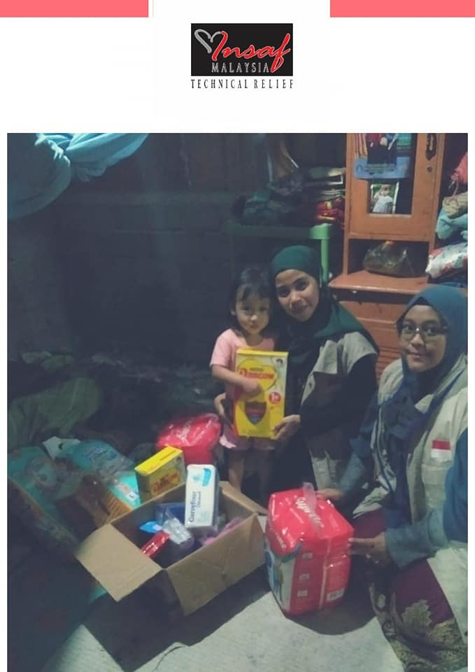 Donggala, Indonesia. Insaf Malaysia with the help of our Indonesian partner NGO Turun Tangan, has delivered to Ms Afryani and her daughter Aqifah basic food items, adult and children's diapers, Anline and Dancow milk and toiletries to help them with their daily needs. Additionally Ms Afryani who is a single mother afflicted with Lupus will receive medical treatment once a week for the whole month of July.